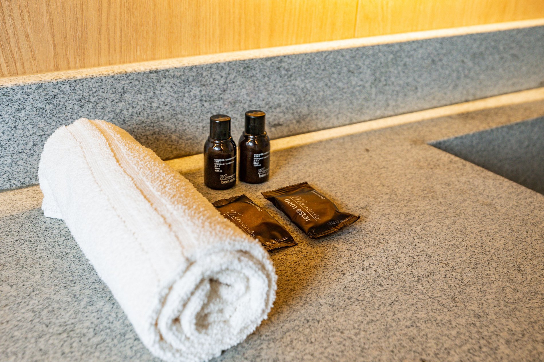 Kit inicial com papel higiênico, sabonete, shampoo e condicionador